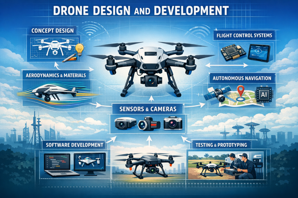 The development process includes conceptual design, frame selection, propulsion system configuration, flight controller integration, and communication systems. Each drone platform is engineered to achieve optimal flight stability, endurance, payload capacity, and operational efficiency.
