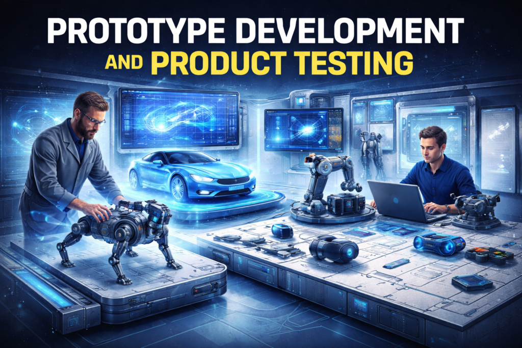 Prototype development transforms digital designs into functional physical models. At LOFTY INNOVATIONS, both concept and functional prototypes are built to evaluate performance and reliability. Testing includes functional performance, mechanical durability, electronic systems, and overall integration. This stage helps identify improvements, refine the design, and ensure the product operates efficiently before moving to full-scale manufacturing.
